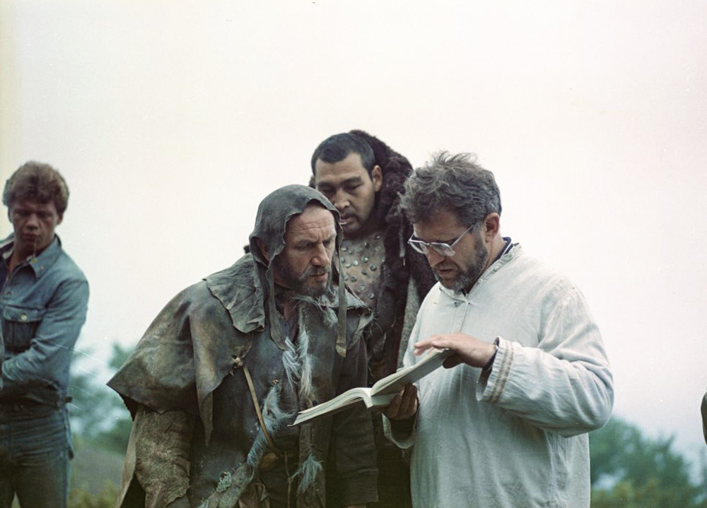 Артисты А. Петренко, В. Высоцкий и режиссер А. Митта на съемках фильма «Сказ про то, как царь Петр арапа женил» (1976)