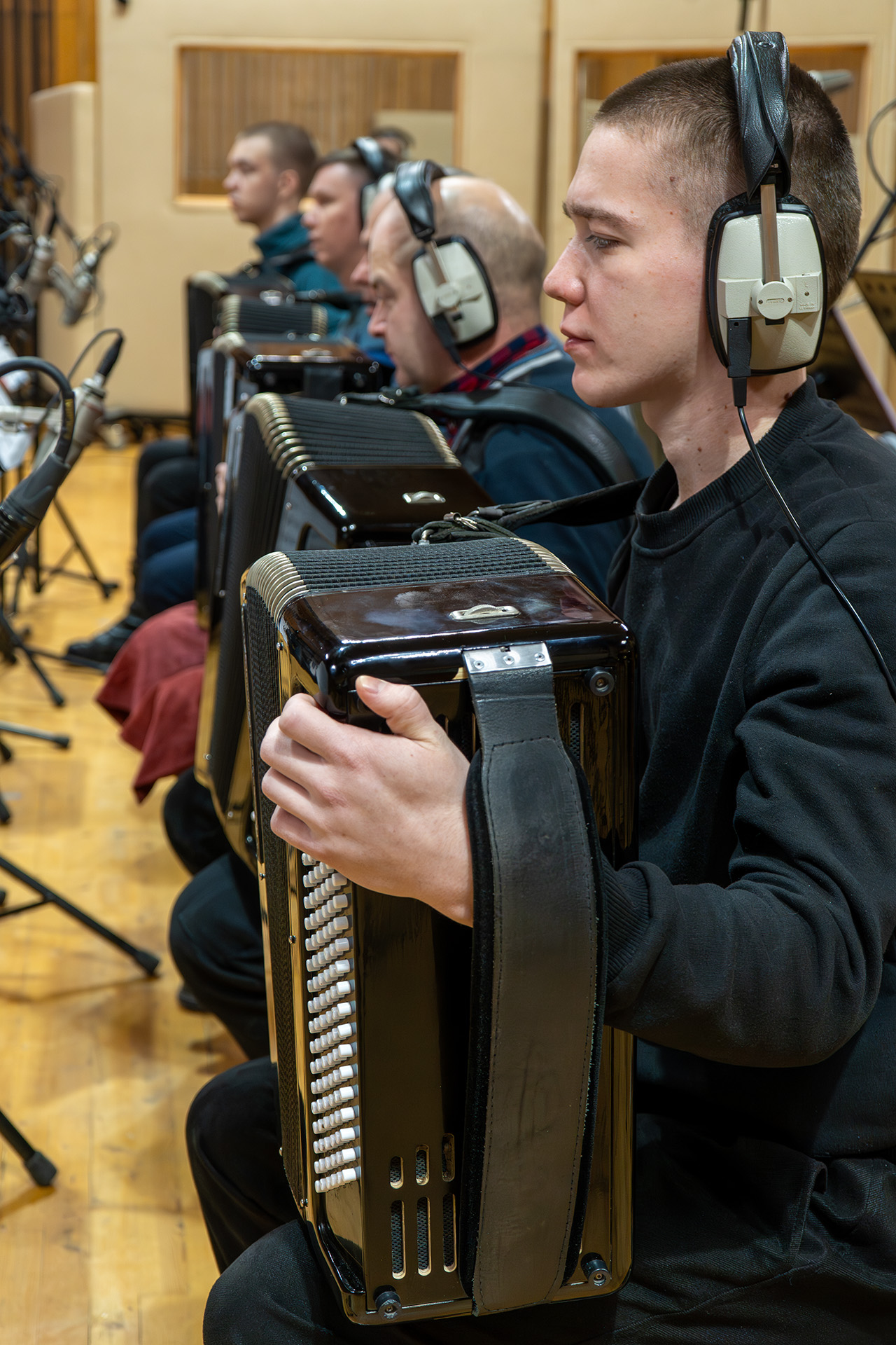 Второй блок записей - 9 февраля - был посвящен монументальному произведению – финалу кантаты «Москва» Петра Ильича Чайковского. Эта работа также имеет богатую историю в ансамбле: её аранжировка для специфического «александровского» состава была создана еще при Александре Васильевиче Александрове. Оригинальная партитура для симфонического оркестра, смешанного хора и солистов (баритона и сопрано) была мастерски переоркестрована с учетом уникальных тембров ансамбля – балалаек, домр, баянов, при сохранении классической духовой группы.