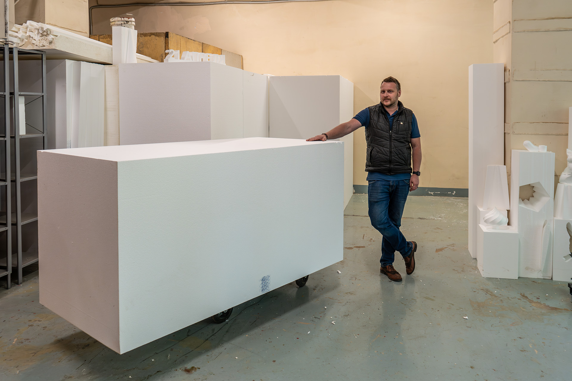 Специалисты «Мосфильм-Декорстрой» на текущий момент обладают всеми техническими возможностями и профессиональными компетенциями для изготовления и монтажа декораций любого уровня сложности – как для кино, так и для телевизионных съемок. Как рассказал Mosfilm.ru бутафор Владимир Щербаков (на фото), пенопласт является один из самых доступных и легких для обработки материалов и, соответственно, крайне востребован для изготовления элементов декораций – карнизов, балясин, перил, плинтусов, колонн, фасадных элементов, различных скульптур и пр. После процедуры так называемого «отфактуривания» предметы приобретают визуальную достоверность – камня, металла, деревянного изделия и др.
