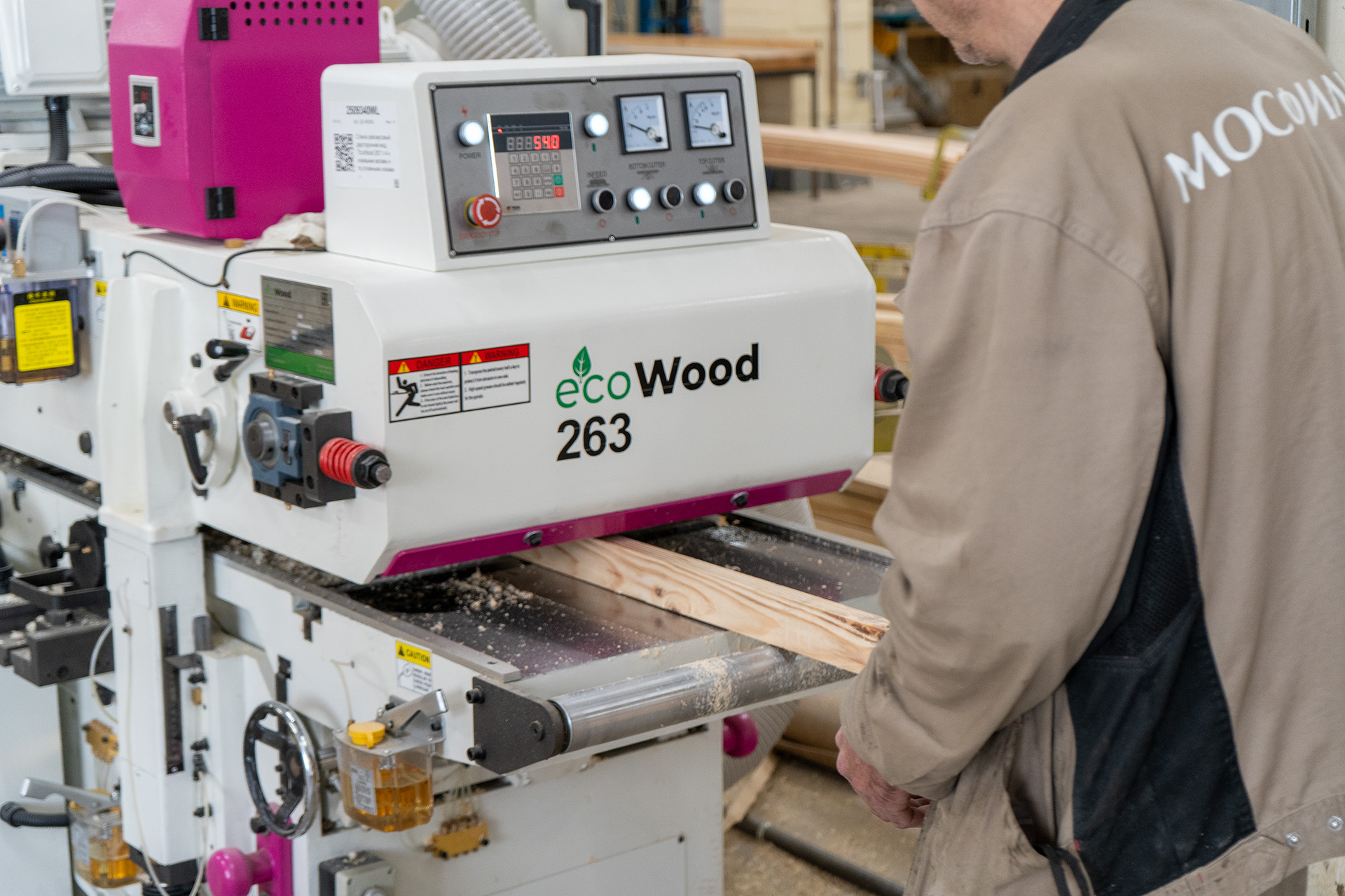 Второй важный «новичок» — двухсторонний рейсмусовый станок «EcoWood263». Казалось бы, строгальный инструмент в цеху был всегда, но старая техника требовала двойной работы: доску нужно было прогнать через односторонний станок, перевернуть и перенастроить заново. Теперь процесс ускорился ровно вдвое.