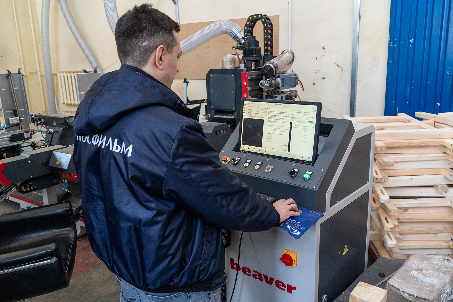 «Здесь доска обрабатывается сразу с двух сторон. Когда идет строительство большой декорации — например, 50 дверей и 100 окон, — это колоссальная экономия времени. Не нужно стоять в очереди и ждать, пока коллега освободит станок», — поясняет бригадир столярного цеха.