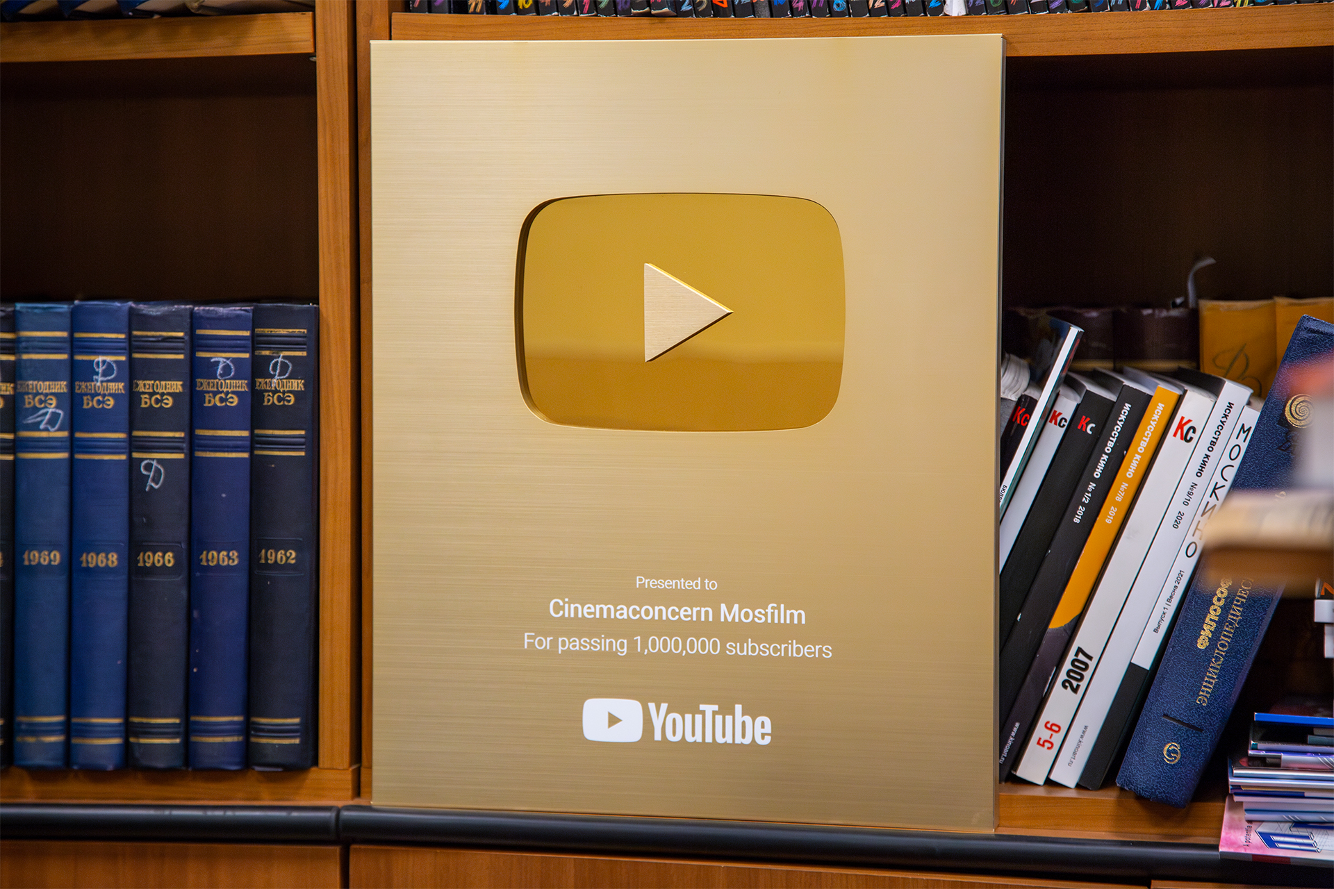 Золотая кнопка YouTube за 1 млн подписчиков на канале Мосфильма. На январь 2024 года на канал уже подписаны 6 млн человек.