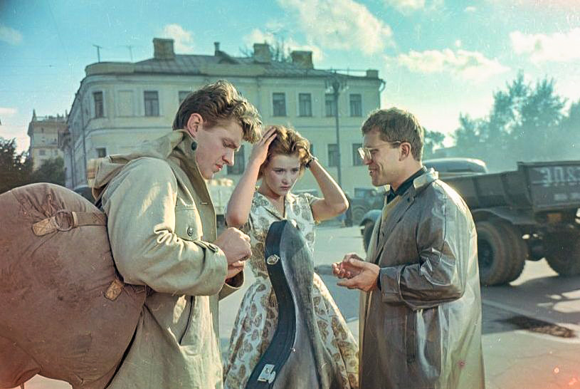 С режиссером Алексеем Салтыковым и оператором Виктором Масленниковым на съемках фильма «Друг мой, Колька!..» (1961)