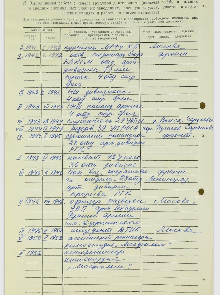 «В начале войны я получил приглашение в Театр Красной Армии, но в моей юношеской голове не укладывалось, как это можно играть, когда нужно палить. Беспощадная статистика времени: мои ровесники, десятиклассники выпуска 1941 года на фронте погибали чаще всех. Наши семнадцатилетние жизни война поглощала особенно охотно, так и не позволив узнать и почувствовать всё счастье возраста. Мне надо было выжить, и войну я вспоминаю, несмотря на весь её ад, самым прекрасным временем в своей судьбе. Именно тогда я познал цену вечным истинам и основные понятия — нравственные, философские, просто житейские — открылись мне во всей своей определенности. Человек на войне однозначен, нам не надо было прибегать к изысканно тонким нюансировкам и мучительным копаниям в тайниках души, чтобы понять, хорош человек или плох, друг он или шкура, добр или так себе. И вдруг оказалось — как много у нас прекрасных людей!» - вспоминал впоследствии режиссер.